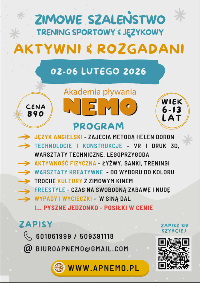 zapraszamy do zapisów na ferie zimowe, które odbędą się w pierwszym tygodniu, czyli od 2-6 lutego 2026.