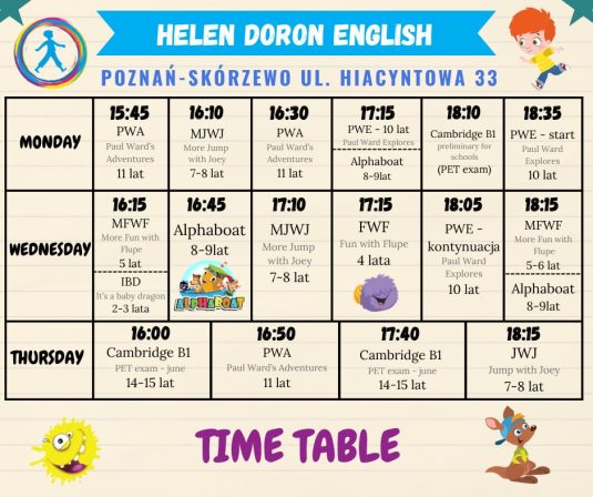Angażując dzieci w naukę poprzez zabawę jesteśmy przekonani, że metoda Helen Doron w Skórzewie jest właściwym wyborem. Ten sposób nauki angielskiego wykorzystuje osłuchanie i naturalną zdolność do zapamiętywania i zastosowania słów. Dzieci mogą poprzez aktywność w grupie rówieśniczej ćwiczyć nie tylko angielski, ale i swoje zdolności. Śmiech, radość, doskonałe efekty? Zapraszamy dzieci otwarte na wspaniałą przygodę. Pełna lista placówek oferująca angielski dla dzieci w Poznaniu dostępna tutaj.