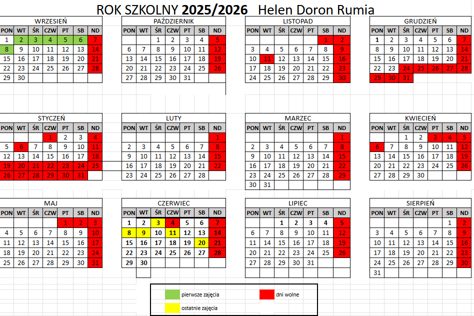 Kalendarz pracy szkoły na rok szkolny 2025/26